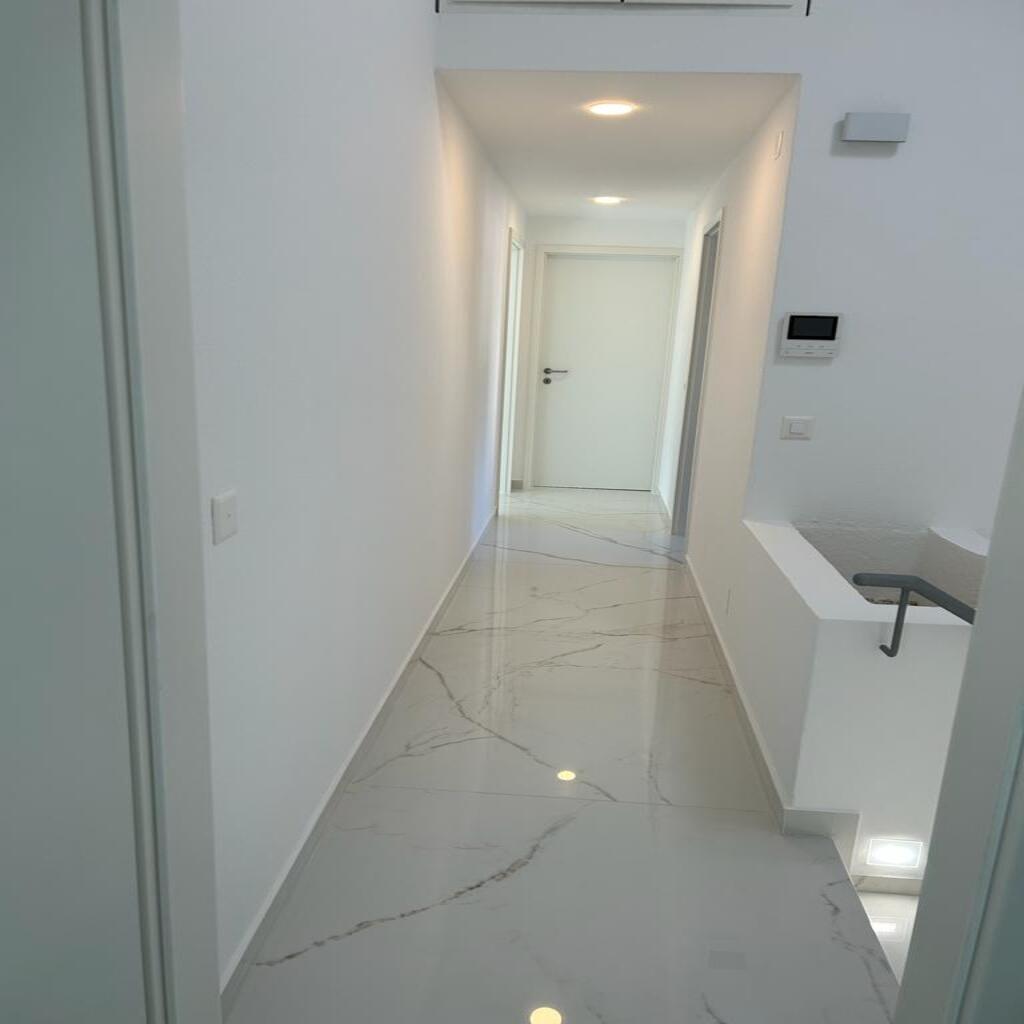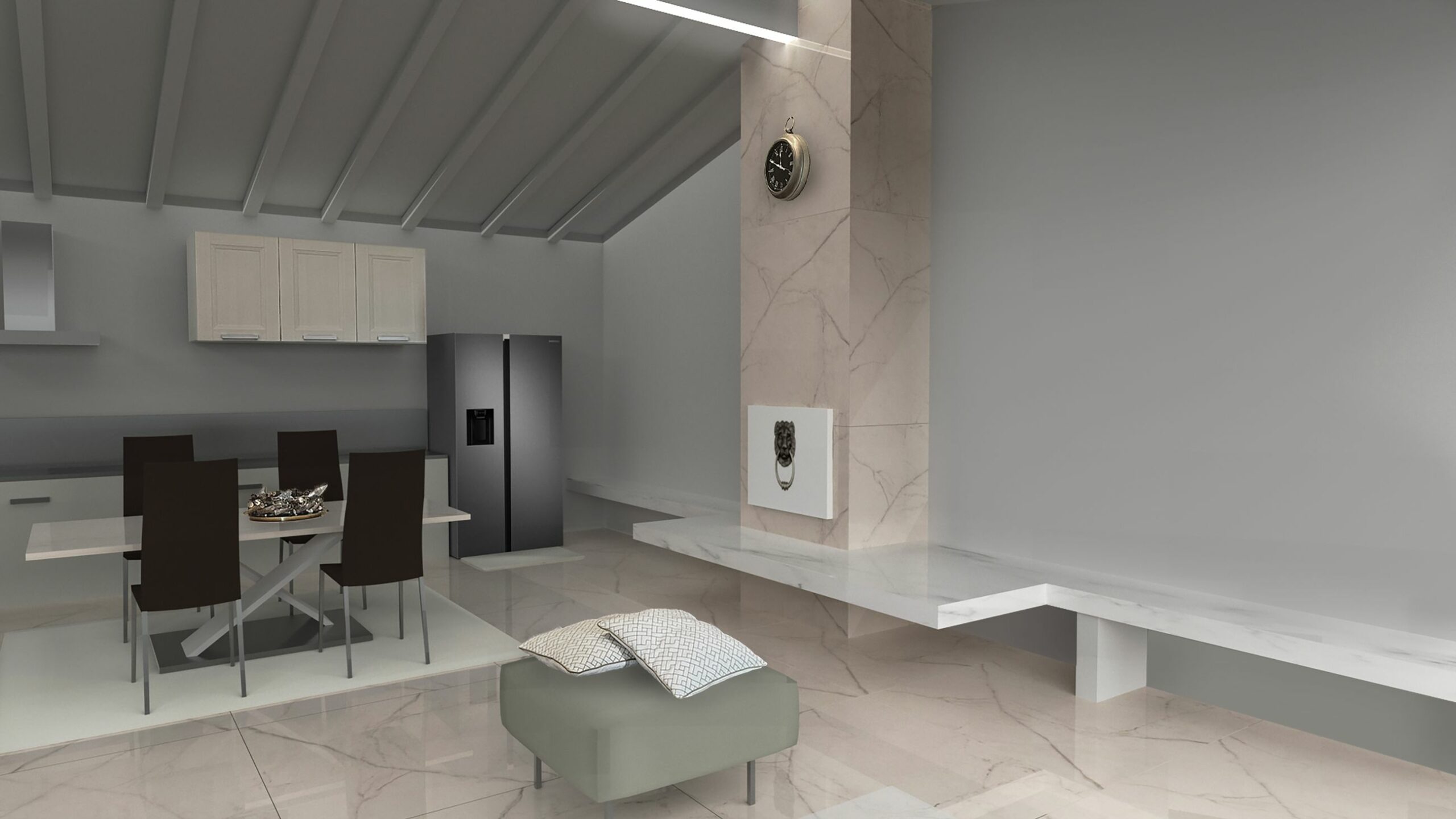 En este proyecto de interiorismo en Balerna, el mármol porcelánico de gran formato actúa como hilo conductor visual y material, desde el pavimento hasta los revestimientos verticales. La distribución abierta y luminosa permite que cada elemento dialogue de forma armoniosa: líneas limpias, tonos neutros y detalles decorativos que combinan lujo sutil con funcionalidad. Destaca la chimenea central revestida, que se erige como un tótem escultórico y divide el espacio sin interrumpir su fluidez.