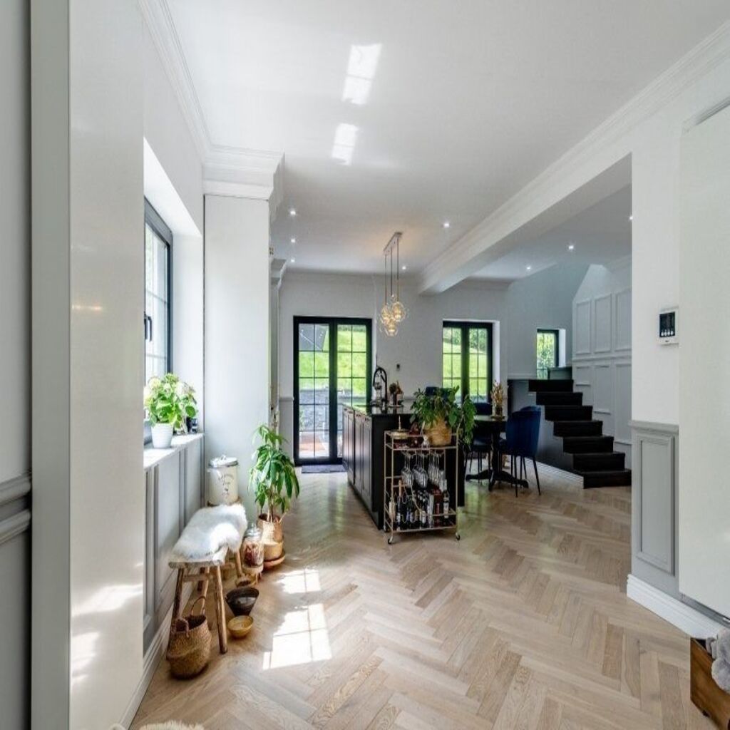Este proyecto en Stadtbredimus fusiona elegancia clásica y confort contemporáneo en una vivienda cuidadosamente diseñada para ofrecer bienestar en cada rincón. El interior destaca por una cuidada selección de materiales nobles, como el pavimento en espiga de roble natural, que aporta continuidad visual y calidez en todos los espacios. La zona de día se organiza de forma abierta y funcional, en un entorno donde la luz natural cobra protagonismo gracias a grandes ventanales y una paleta cromática neutra que potencia la luminosidad del conjunto.